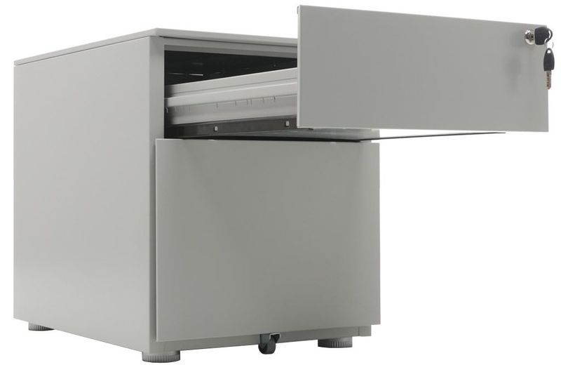 - Опции: пластиковые лотки и металлический ящик для канцелярских принадлежностей и других предметов. Возможность комбинирования цветов: корпус + фасады ящиков и крышка (конструкция тумбы металл+металл). Или отделка фасадов ящиков и крыши тумбы ламинированной плитой ЛДСП